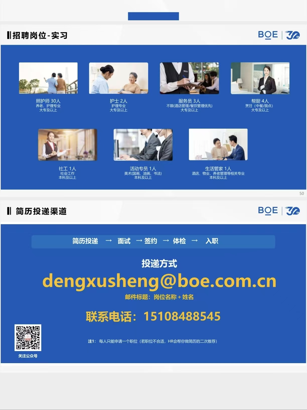 2026届实习生(准就业)招聘实习单位:成都京东方智慧医养社区·锦城拾光单位简介:京东方智慧医养社区是京东方科技集团旗下的专业医养品牌,作为一站式康养服务和解决方案提供商,充分利用前沿科学技术,采用医养融合、智慧斌能、活力共享的服务理念,依托自有数字医疗体系,为长者提供集医、康、养、护、乐、学于一体的高品质健康生活服务。招聘岗位:照护师:20人要求:1、大专(公办)及以上学历,养老及护理相关专业;2、已经在养老机构完成6个月以上的教学实习并通过,或在医院实习并通过的其他优秀实习生;3、决定在养老行业养老护理员岗位长期发展;实习期:实习至6月底,符合转正要求者7月可签订正式劳动关系。实习薪资:已经在养老机构完成6个月以上实习的140/天,未完成的80/天;夜班额外补贴50/晚。福利待遇:提供宿舍、工作餐,工作环境好。联系人:张老师联系方式:15108488545